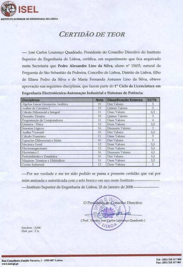 диплом : “Instituto Superior de Engenharia de Lisboa”