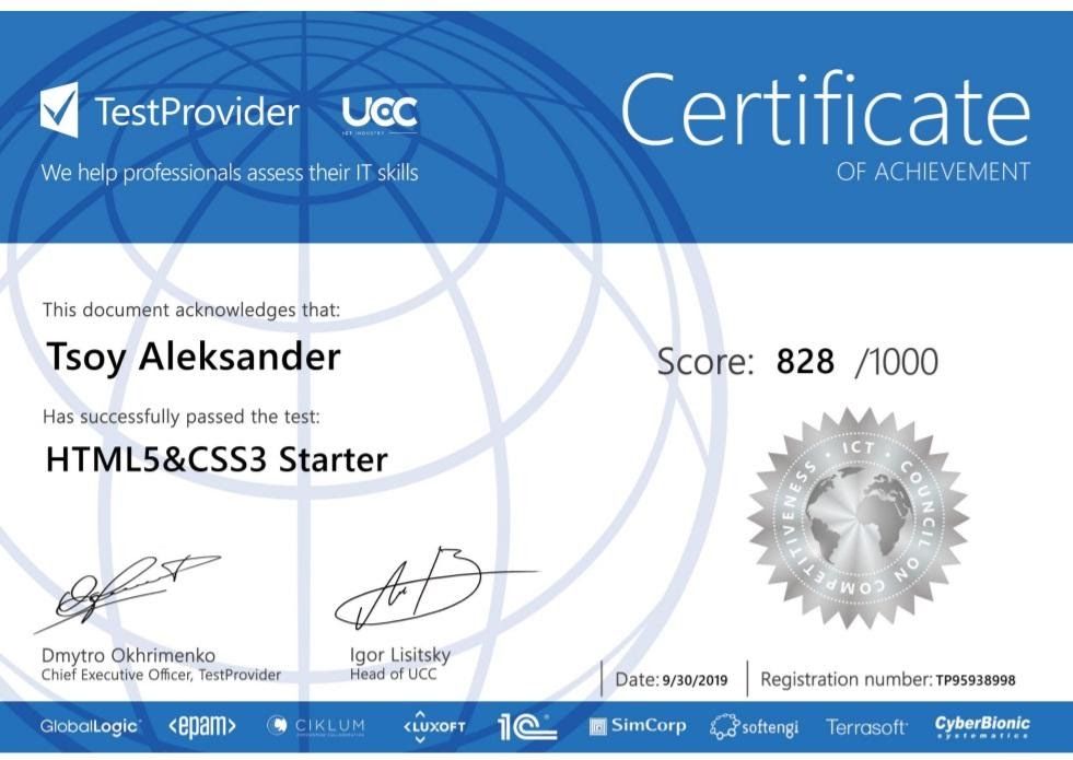 I studied at ITVDN IT Academy, Front-end course. I've passed all tests and I've got HTML5CSS3,