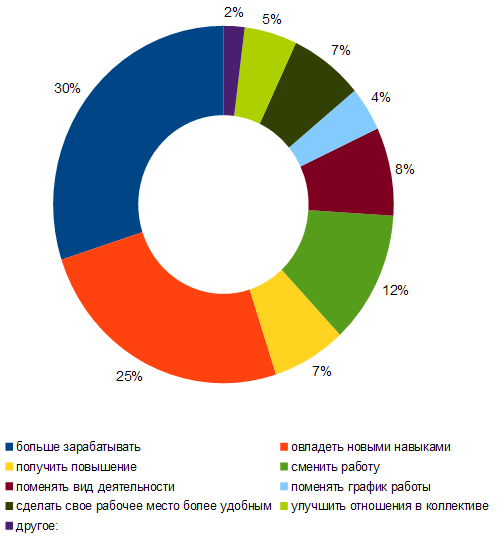 Більшість харків'ян пов'язують свої сподівання зі збільшенням заробітної плати. Досягти більшого, ніж зараз, доходу, сподіваються 30% опитаних. Ймовірно, для цього фахівцям бракує певних навичок та умінь, бо опанувати нові навички наступного року бажає 25% респондентів. На третьому місці за популярністю — бажання поміняти місце роботи, його висловили 12% осіб, які брали участь у анкетуванні. 8% харків'ян взагалі мріють змінити рід діяльності в найближчому майбутньому. Такі бажання, як отримати підвищення та зробити більш зручним робоче місце, висловили по 7% опитаних. І лише 5% респондентів хочуть покращити свої стосунки у колективі.
