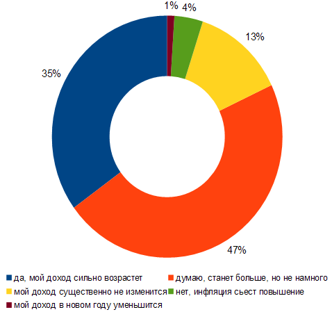 Напередодні нового року у багатьох українців з'являються надії на досягнення кращого рівня життя та матеріального статку. Проте більшість опитаних харків'ян (47%) хоч і очікують на збільшення свого доходу, але багато на що не розраховують. На великий стрибок у своїй зарплаті наступного року сподіваються 35% респондентів. Аж ніяких змін у матеріальному плані не очікують 13% опитаних. Бояться інфляції 4%. Песимістично налаштованим виявився лише 1% користувачів, ці люди припускають, що наступного року їх доходи значно зменшаться.