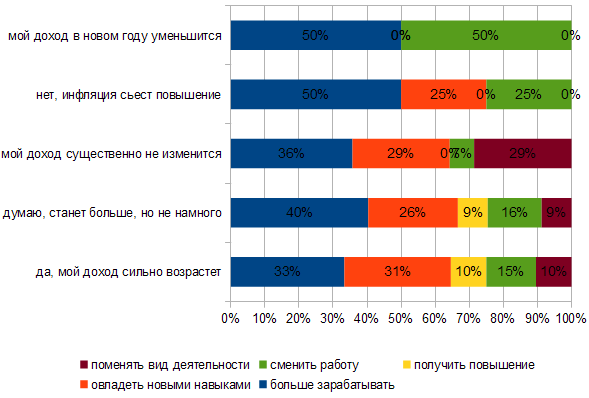 Харків'яни, які очікують у новому році високого зростання свого доходу, здебільшого (33%) пов'язують це зростання зі своїм власним прагненням більше працювати і, відповідно, більше заробляти. Також зростання матеріального достатку, на думку 10% опитаних, залежить від того, чи підвищать їх, чи дадуть нову посаду з вищою оплатою праці. Підвищення рівня своєї освіти та здобуття нових навичок, умінь та знань має принести свої дивіденди 31% респондентів. Дивно, але більшість тих працівників, які прагнуть змінити вид своєї діяльності (29%) не очікують у зв'язку з цим своїм вчинком жодних змін у матеріальному плані, а половина тих опитаних, які припускають зменшення доходу, збираються своє місце роботи поміняти.