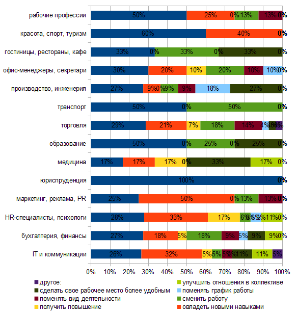 Також ми зробили висновки, які плани будують представники різних професій. Більше заробляти наступного року мріють усі юристи (100%), 60% представників сфер краси, спорту та туризму. У рівній мірі про збільшення доходу мріють працівники освіти та представники робітничих професій (по 50%). Опанувати нові навички прагнуть, в першу чергу, маркетологи та рекламісти (50%), а також HR-фахівці та психологи (33%) та айтішники (32%). HR-фахівці також сподіваються на підвищення на посаді (17%), як і медики (17%). Змінити місце роботи у 2013 році мають намір працівники сфери транспорту (50%) та сфери обслуговування – працівники готелів, кафе та ресторанів (33%). Повністю змінити вид своєї діяльності хотіли б 13% робітників, 14% працівників торгівлі та 13% маркетологів. Змінити графік роботи планують 18% інженерів. А зробити своє робоче місце комфортнішим і красивішим хочуть 33% медичних працівників та 33% працівників готельного та ресторанного бізнесу. Медики також хотіли б покращити свої стосунки у колективі (17%), як і психологи з айтішниками (по 11% випадків).