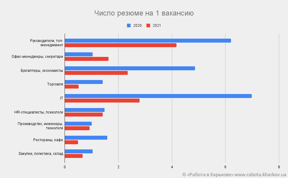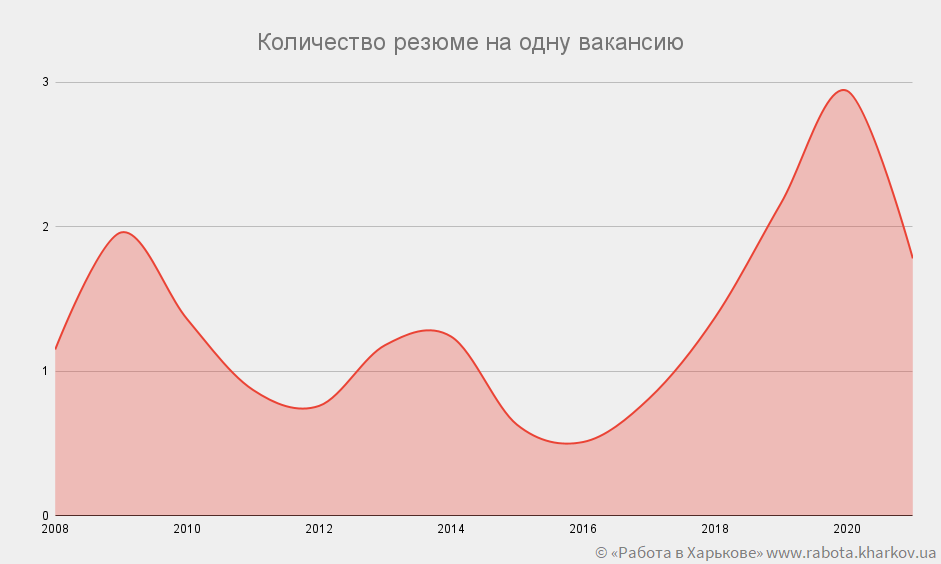 Рассматривая динамику конкуренции на вакансию с 2010 года, можно проследить ситуацию на рынке труда. Как можно заметить, в 2011–2012 гг. был даже небольшой дефицит рабочей силы. Это было связано с постепенным укреплением украинской экономики после кризиса 2008 года. В 2013 −2014 гг. ситуация снова стала ухудшаться, и число соискателей на одну вакансию стало возрастать. Но в 2015–2016 гг. снова наблюдалась постепенная стабилизация рынка труда — рабочая сила снова находилась в недостатке. На одну вакансию в 2015 г. приходилось 0,63 кандидата, а в 2016 г. — 0,88. 2017 и 2018 также продолжили рост этого показателя, а в 2019 на 1 вакансию приходится 2,16 кандидата. 2020 год способствовал значительному росту этого показателя, и он достиг пикового значения — 2,94 кандидата на вакансию — больше, чем после кризисного для украинской экономики 2009 года. Сейчас конкуренция стала постепенно снижаться, и уже составляет 1,78 человека на 1 вакансию.