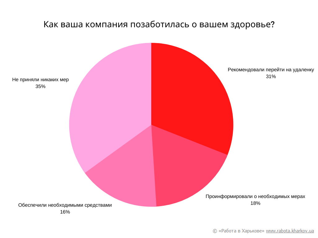В результате опроса выяснилось, что всего 16% работодателей обеспечили своих сотрудников необходимыми средствами защиты, а еще 18% ограничились информированием о нужных мерах для защиты здоровья. Это довольно мало, так как мы видим, что большинство все же продолжает работать. 35% компаний не приняли никаких мер для защиты своих работников, переложив ответственность за безопасность на рабочем месте на них самих. Такая ситуация заставляет задуматься в дальнейшем, нужно ли продолжать работать в компании.