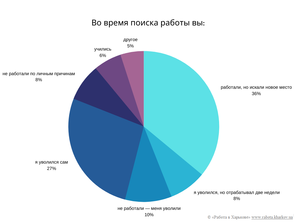 Также мы выяснили, что большинство — 36% ответивших — работали и параллельно искали новое место. Это оптимальный вариант, ведь в глазах работодателей наиболее ценный тот кандидат, на чьи услуги есть спрос. Еще 27% соискателей уволились сами, и только затем приступили к поискам нового места. Это отличный способ для тех, у кого есть небольшая финансовая подушка — можно немного отдохнуть от рабочей рутины, прежде чем снова за нее браться на новой работе.